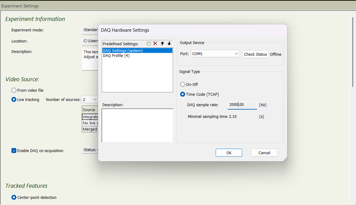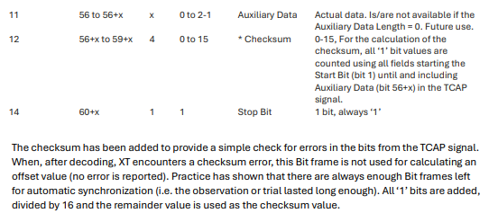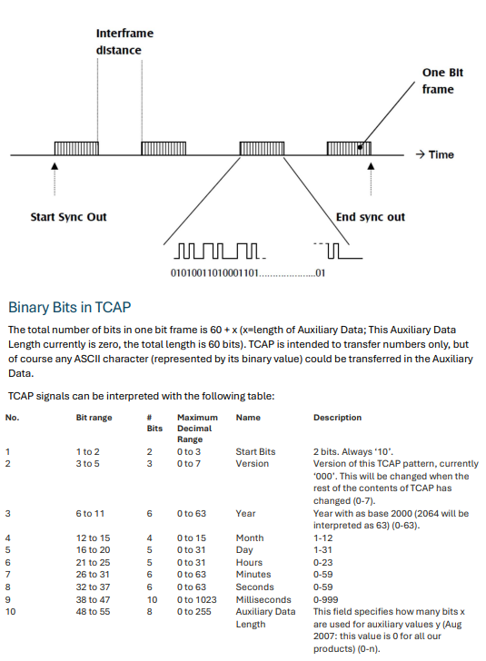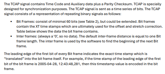 I. The TCAP signal contains Time Code and Auxiliary data plus a Parity Checksum (for more details please refer to " Noldus EthoVision XT Combined KB Article "). A series of bits called a frame is sent from the EthoVision XT computer to the external DAQ device. Each frame contains the current date and time and additional information. synchronization of tracking and external data is more accurate using the Time Code signal because it is done for more than two offset points and not just at the start and stop of acquisition as with the On-Off signal.