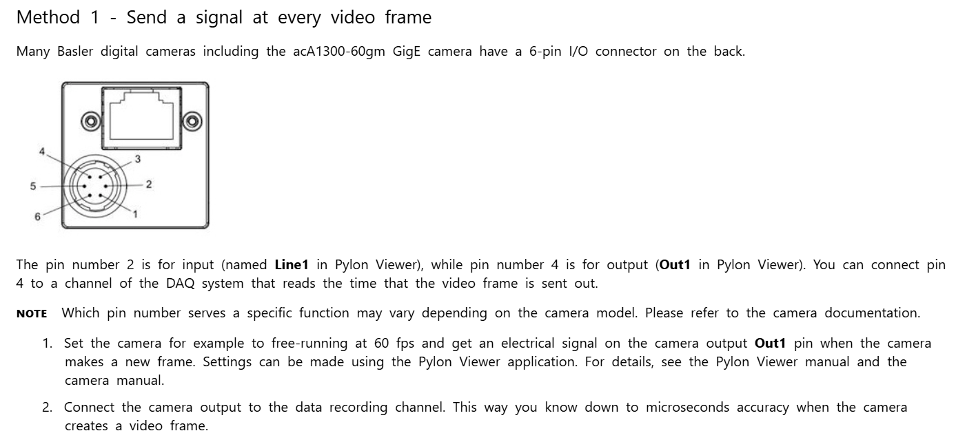 Refer to EthoVision XT 18 Help. It is possible to configure the output pin from the 6-pin I/O connector on the back of the Basler Camera to send TTL pulses to the NSPs. This may need device configuration with Basler camera's hardware and software, and device integration outside of EthoVision and Central/NSPs.