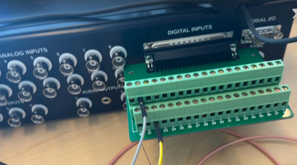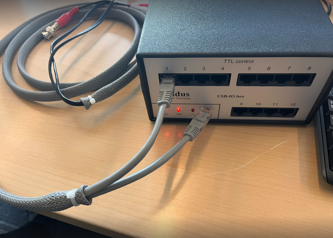 TTL port on the I/O box to Digital breakout adaptor/Digital port on the NSP, with Ethernet to BNC cable, BNC to alligator cable in between. Please customize accordingly.