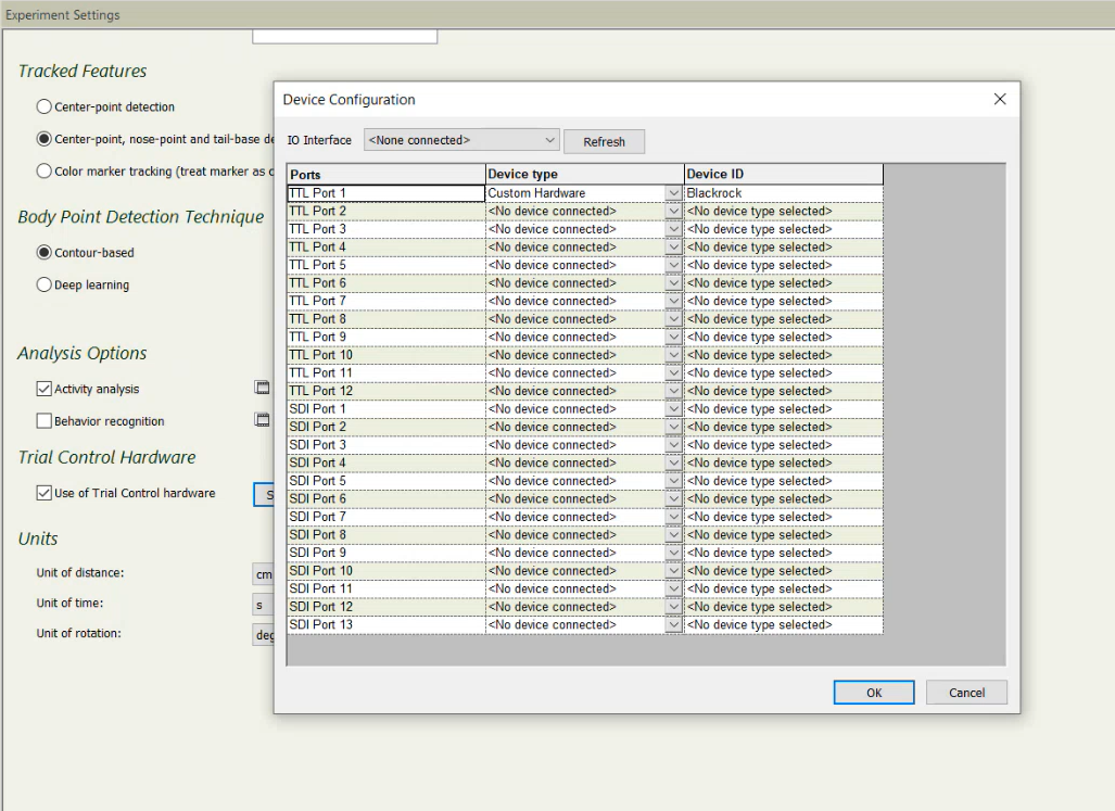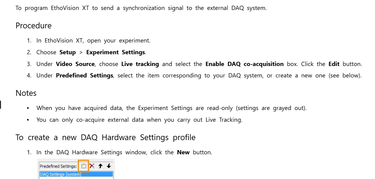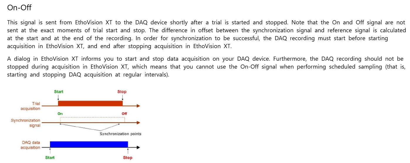 For applications that only needs aligned start and stop of the behavior trial with external data acquisition, EthoVision could just send on and off signals (can be TTL) to the external data acquisition device. Refer to EthoVision XT 18 Help, note that the On and Off signal are not sent at the exact moments of the trial start and stop... This functionality may not be very useful for neural data recording synchronization.